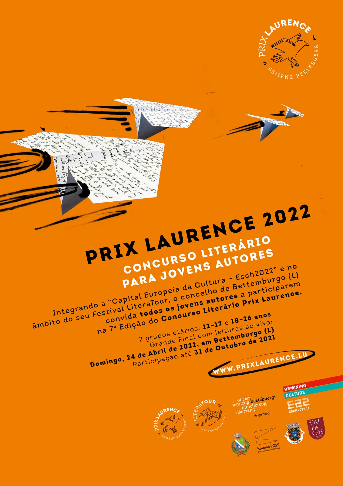No âmbito da sua participação em “Esch2022, Capital Europeia da Cultura” e no festival LiteraTour, o Município de Bettembourg (Luxemburgo) convida os jovens luxemburgueses e de cidades geminadas como Valpaços (Portugal) para participar na 7.ª edição do Prémio Laurence.