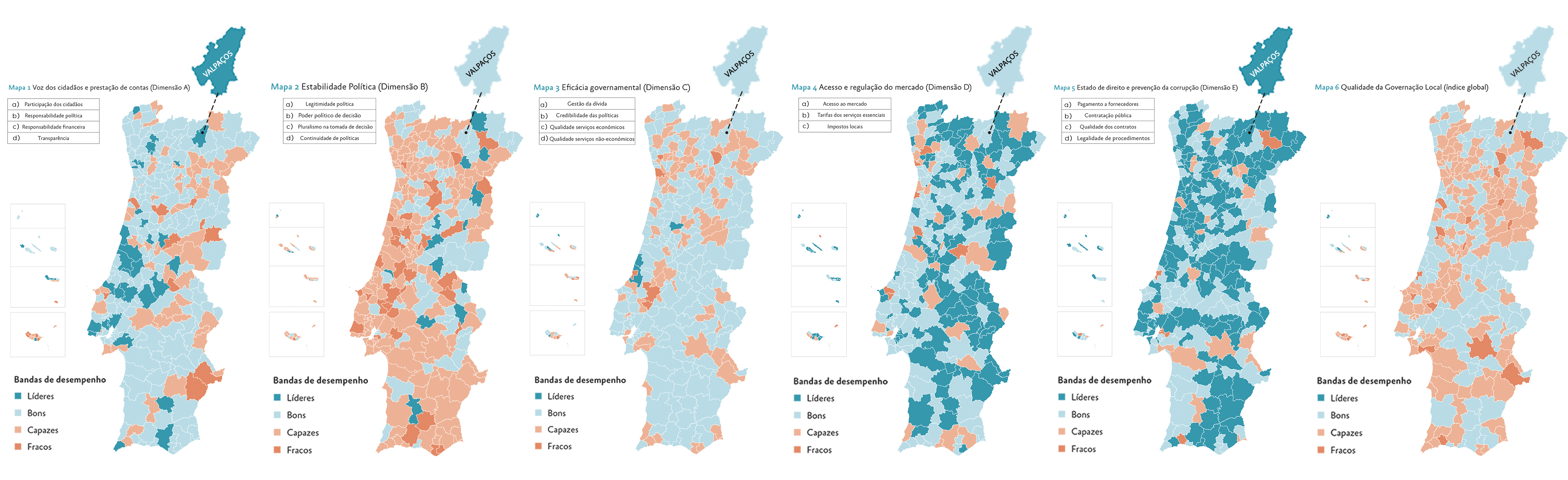 No referido estudo editado, o trabalho das autarquias é analisado em cinco dimensões –”Voz dos cidadãos e prestação de contas”; “Estabilidade Política”; “Eficácia governamental”; “Acesso e regulamentação do mercado” e “Estado de direito e prevenção da corrupção” – e 22 indicadores como, por exemplo, a transparência, gestão da dívida, procedimentos de contratação pública ou a qualidade dos contratos submetidos à fiscalização prévia do Tribunal de Contas.