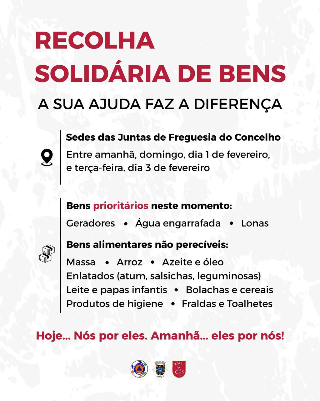 Apela-se à colaboração de todos, devendo os bens ser entregues nas 𝘀𝗲𝗱𝗲𝘀 𝗱𝗮𝘀 𝗝𝘂𝗻𝘁𝗮𝘀 𝗱𝗲 𝗙𝗿𝗲𝗴𝘂𝗲𝘀𝗶𝗮 𝗱𝗼 𝗖𝗼𝗻𝗰𝗲𝗹𝗵𝗼, 𝗲𝗻𝘁𝗿𝗲 𝗮𝗺𝗮𝗻𝗵𝗮̃, 𝗱𝗼𝗺𝗶𝗻𝗴𝗼, 𝗱𝗶𝗮 𝟭 𝗱𝗲 𝗳𝗲𝘃𝗲𝗿𝗲𝗶𝗿𝗼, 𝗲 𝘁𝗲𝗿𝗰̧𝗮-𝗳𝗲𝗶𝗿𝗮, 𝗱𝗶𝗮 𝟯 𝗱𝗲 𝗳𝗲𝘃𝗲𝗿𝗲𝗶𝗿𝗼.