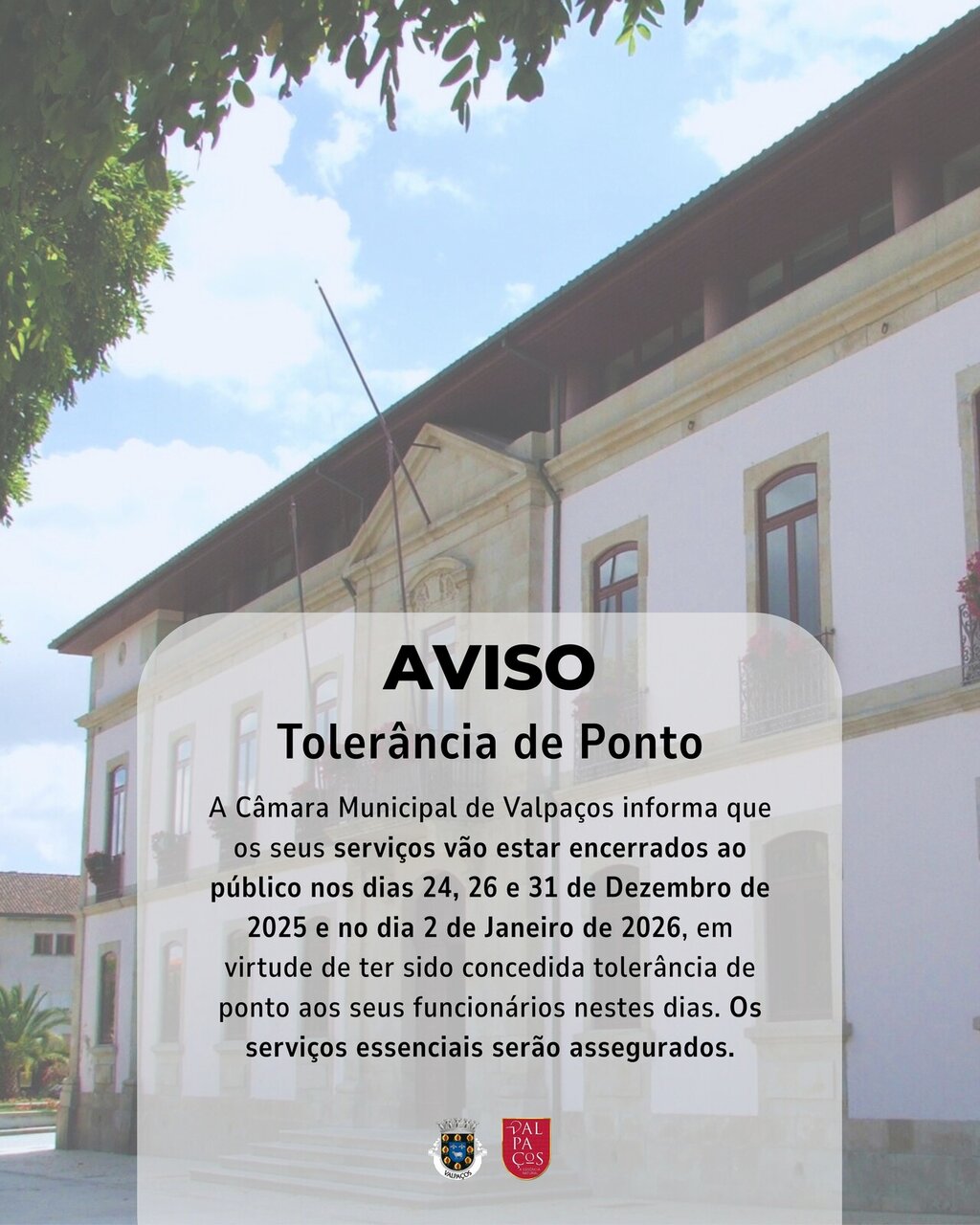 O 𝗠𝘂𝗻𝗶𝗰𝗶́𝗽𝗶𝗼 𝗱𝗲 𝗩𝗮𝗹𝗽𝗮𝗰̧𝗼𝘀 informa que os serviços da Câmara Municipal estarão encerrados nos dias 𝟮𝟰, 𝟮𝟲 𝗲 𝟯𝟭 𝗱𝗲 𝗱𝗲𝘇𝗲𝗺𝗯𝗿𝗼, na sequência da tolerância de ponto concedida pelo Governo aos funcionários e colaboradores da Administração Pública.