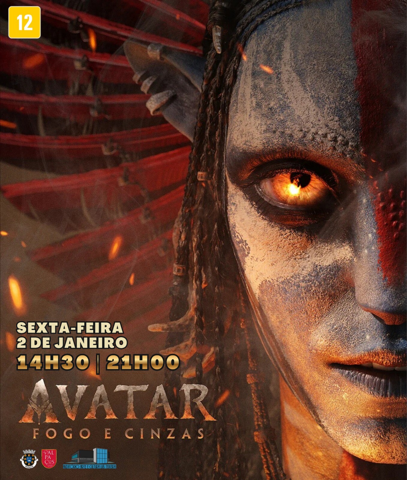 🎬 𝘾𝙞𝙣𝙚𝙢𝙖 (𝙈/12) – Em AVATAR - FOGO E CINZAS, James Cameron leva o público de volta a Pandora numa nova aventura imersiva, com Jake Sully (Sam Worthington), o ex-fuzileiro transformado em líder Na’vi, a guerreira Na’vi Neytiri (Zoe Saldaña) e a família Sully.